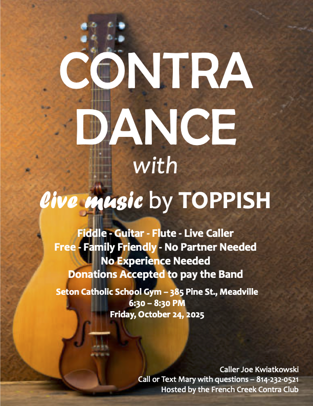 Mary Burkett is doing important work of maintaining tradition, bringing generations together, and providing a place for the community to connect through joy. Several times a year she organizes a Contra Dance, a social dance with roots in French and English county dances from the 1700’s. Despite its long history, it is a vibrant American tradition. Contras are held all over the U.S. and Canada. Almost all have live music, typically fiddle driven folk tunes. Before COVID Mary began attending Allegheny College’s weekly contra dances with her large family. She said, “The kids loved it and the band was wonderful.” Post COVID the college did not revive the dances and Mary said her children challenged her to fill the need. "They said, ‘Why do we have to go somewhere else for whatever we're doing? Like, we gotta go to Erie for the art museum. We gotta go to Pittsburgh for other things… why can't we just go into Meadville and do things?’” Seton School was happy to provide their gym, and the band, Toppish, was willing to play music and find a dance caller.