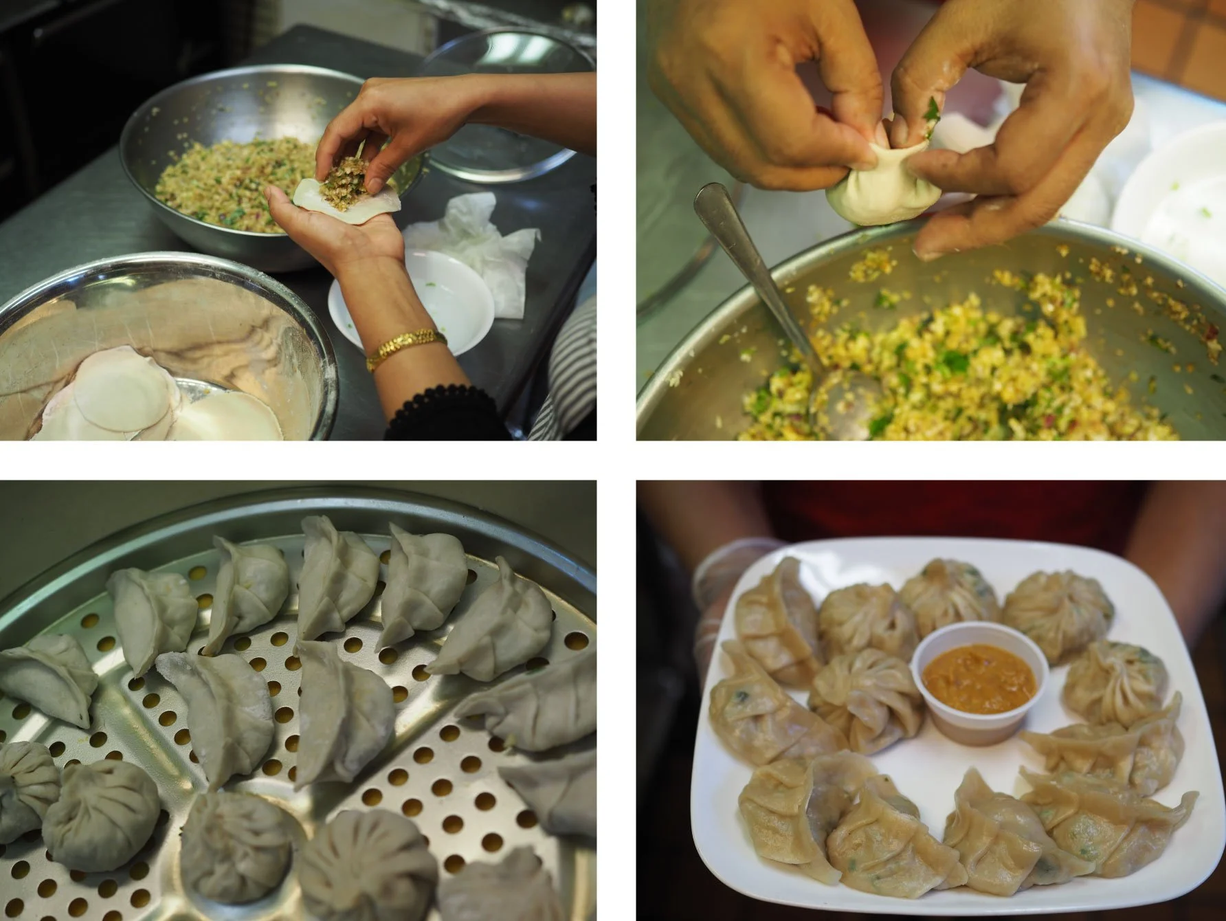 “Momos are party food, family together food for special days like weddings or holidays,” says Gyan, “They are a lot of work, but everybody’s favorite.” There is no one recipe for momo. Aside from a base of cabbage, everyone makes the filling according to their personal taste. Sometimes momos are filled with ground chicken or pork.